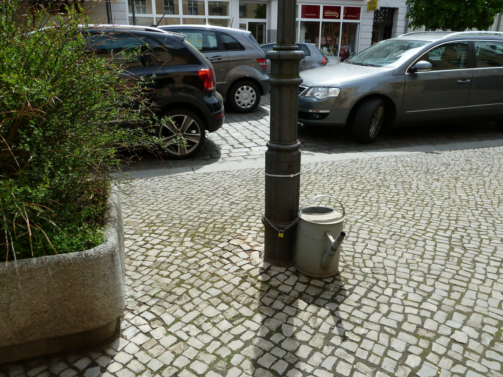 На центральной улице нас очень позабавило сочетание красивых домов и лейки, пристёгнутой к фонарю