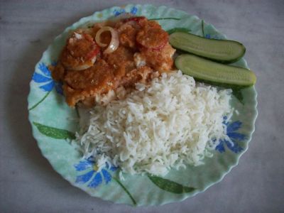 На гарнир хорошо подать отварной рис или картофельное пюре.