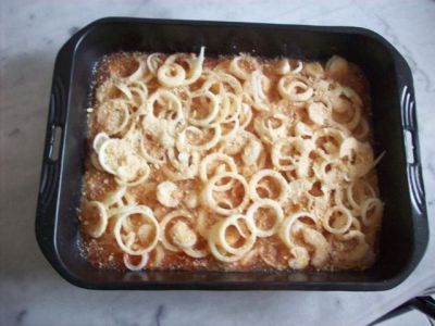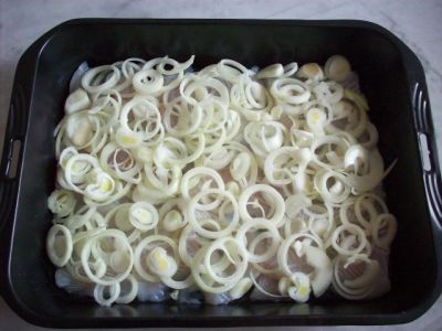 Посолить, посыпать кольцами лука.