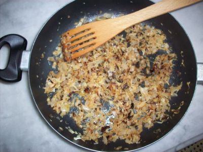 Лук мелко нарежем и обжарим на смеси растительного и сливочного масел.