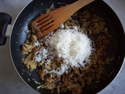 Снимем с огня и добавим к луку с огурцами 1 стакан отварного риса.
