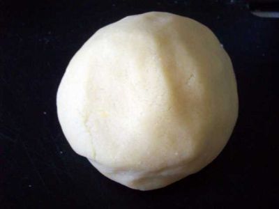 Когда крошка готова, выкладывем её на подсыпанную мукой досточку и недолго месим руками, пока тесто не склеится в шар.